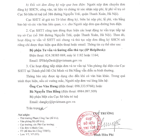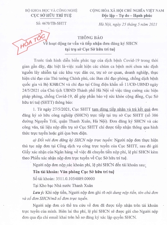 Thông báo về hoạt động tư vấn và tiếp nhận đơn đăng ký SHCN tại trụ sở Cục sở hữu trí tuệ